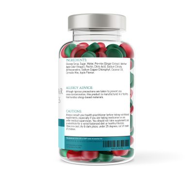 Glucose Syrup, Sugar, Water, Pre-mix (Ginger Extract, Mother Apple Cider Vinegar), Pectin, Citric Acid, Sodium Citrate, Anthocyanadins, Sodium Copper Chlorophyll, Coconut Oil, Carnauba Wax, Apple Flavour.
