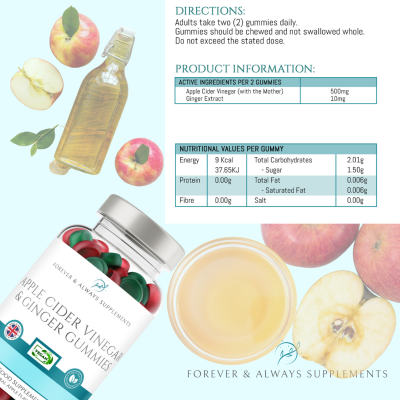 Delicious natural apple-flavoured Apple Cider Vinegar gummies with ginger extract, formulated to provide all of the benefits without the sour cider vinegar taste.