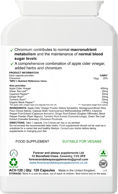 This food supplement has been formulated with a specialist blend of synergistic herbs and nutrients. Each capsule combines 400mg of apple cider vinegar powder with cayenne, ginger root, turmeric, green tea leaf, organic black pepper and chromium.