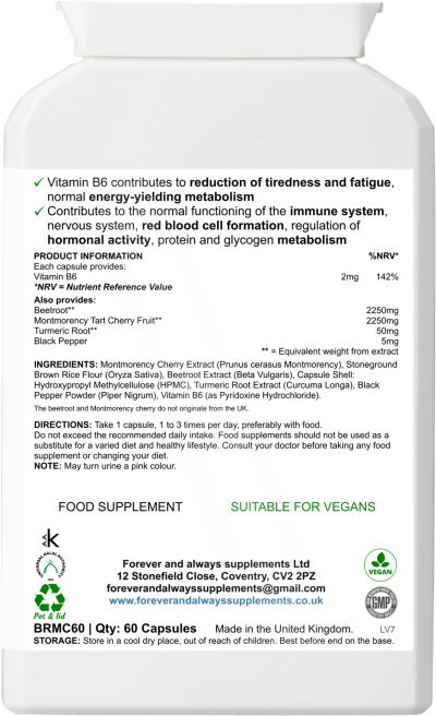 INGREDIENTS: Montmorency Cherry Extract (Prunus cerasus Montmorency), Stoneground Brown Rice Flour (Oryza Sativa), Beetroot Extract (Beta Vulgaris), Capsule Shell: Hydroxypropyl Methylcellulose (HPMC), Turmeric Root Extract (Curcuma Longa), Black Pepper Powder (Piper Nigrum), Vitamin B6 (as Pyridoxine Hydrochloride).