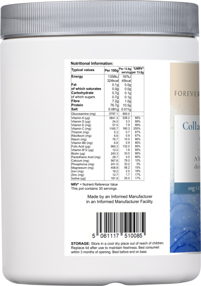 A delicious drink mix, which contains high-strength, high quality hydrolysed collagen (collagen peptides) – 10g / serving – plus glucosamine HCl (800mg / serving), vitamins and minerals.