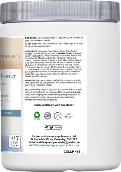 Ingredients: Connective Tissue Blend: (Spray Dried Bovine Collagen, Glucosamine Hydrochloride (CRUSTACEANS); Fibruline® (Chicory (Dietary) Fibre); Acidity Regulator (Citric Acid); Vitamin and Mineral Premix: (Magnesium Sulphate, Tri-Calcium Phosphate, Calcium Carbonate, Vitamin C (Ascorbic Acid), Maltodextrin, Vitamin E (Dl-Alpha Tocopherol), Nicotinamide, Ferrous Fumarate, Vitamin B5 (Calcium D Pantothenate), Vitamin A (Retinyl Acetate), Vitamin B12 (Cyanocobalamin), Vitamin B2 (Riboflavin 5-phosphate), Vitamin D3 (Cholcalciferol), Vitamin B6 (Pyridoxine Hydrochloride), Thiamine, Zinc Sulphate Monohydrate, Folic Acid (Folacin), Biotin, Potassium Iodide); Flavouring, Natural Colour (Beta Carotene), Sweetener: Steviol glycosides.