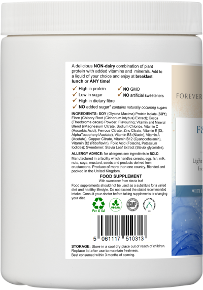 Ingredients: SOY (Glycina Maxima) Protein Isolate (SOY); Fibre (Chicory Root (Cichorium intybus) Extract); Cocoa (Theobroma cacao) Powder; Flavouring; Vitamin and Mineral Blend ((Magnesium Citrate, Sodium Chloride, Vitamin C (Ascorbic Acid), Ferrous Citrate, Zinc Citrate, Vitamin E (DL-AlphaTocopheryl Acetate), Vitamin B3 (Niacin), Vitamin A (Acetate), Copper Citrate, Vitamin B12 (Cyanocobalamin), Vitamin B2 (Riboflavin), Folic Acid (Folacin), Potassium Iodide)); Sweetener: Stevia Leaf Extract (Steviol glycosides).