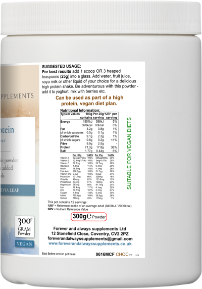 Chocolate flavour vegan protein powder and light meal shake, with non-GM soy, dietary fibre, vitamins and minerals.
