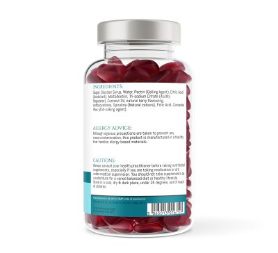 INGREDIENTS: Sugar, Glucose Syrup, Water, Pectin (Gelling Agent), Citric Acid (Acidulant), Maltodextrin, Tri-sodium Citrate (Acidity Regulator), Coconut Oil, natural berry flavouring, Anthocyanines, Spirulina (Natural colours), Folic Acid, Carnauba Wax (Anti-caking agent).