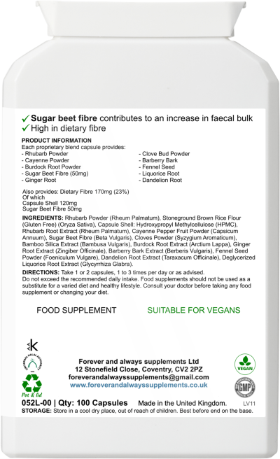 INGREDIENTS: Rhubarb Powder (Rheum Palmatum), Stoneground Brown Rice Flour (Gluten Free) (Oryza Sativa), Capsule Shell: Hydroxypropyl Methylcellulose (HPMC), Rhubarb Root Extract (Rheum Palmatum), Cayenne Pepper Fruit Powder (Capsicum Annuum), Sugar Beet Fibre (Beta Vulgaris), Cloves Powder (Syzygium Aromaticum), Bamboo Silica Extract (Bambusa Vulgaris), Burdock Root Extract (Arctium Lappa), Ginger Root Extract (Zingiber Officinale), Barberry Bark Extract (Berberis Vulgaris), Fennel Seed Powder (Foeniculum Vulgare), Dandelion Root Extract (Taraxacum Officinale), Deglycerized Liquorice Root Extract (Glycyrrhiza Glabra).