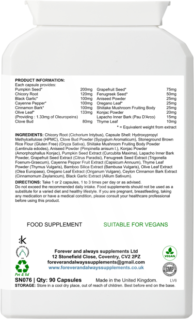 INGREDIENTS: Chicory Root (Cichorium Intybus), Capsule Shell: Hydroxypropyl Methylcellulose (HPMC), Clove Bud Powder (Syzygium Aromaticum), Stoneground Brown Rice Flour (Gluten Free) (Oryza Sativa), Shiitake Mushroom Fruiting Body Powder (Lentinula edodes), Aniseed Powder (Pimpinella anisum l.), Glucomannan Powder (Amorphophallus Konjac), Pumpkin Seed Extract (Curcubita Maxima), Lapacho Inner Bark Powder, Grapefruit Seed Extract (Citrus Paradisi), Fenugreek Seed Extract (Trigonella Foenum-Graecum), Cayenne Pepper Fruit Extract (Capsicum Annuum), Thyme Leaf Powder (Thymus Vulgaris), Olive Leaf Extract (Olea Europaea), Oregano Leaf Extract (Origanum Vulgare), Ceylon Cinnamon Bark Extract (Cinnamomum Zeylanicum), Black Garlic Extract (Allium Sativum).
