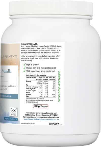 A delicious vanilla flavoured whey protein supplement, derived from a blend of high quality whey protein concentrate and whey protein isolate.