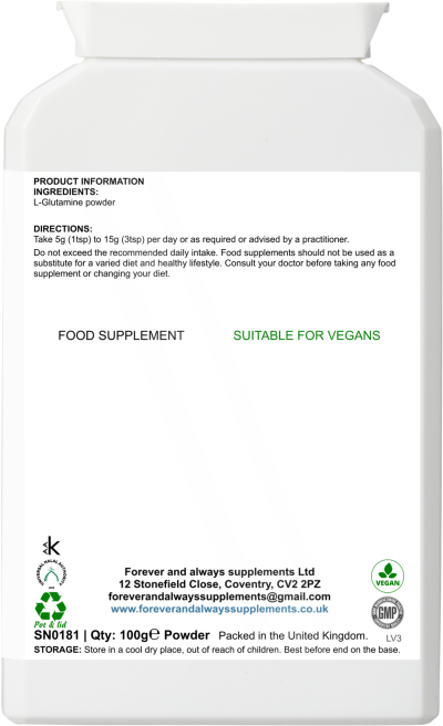 This L-Glutamine food supplement is sourced from fermented glucose.