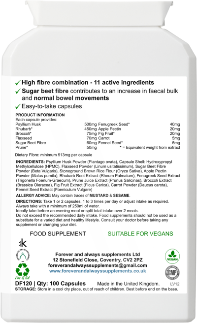 INGREDIENTS: Psyllium Husk Powder (Plantago ovata), Capsule Shell: Hydroxypropyl Methylcellulose (HPMC), Flaxseed Powder (Linum usitatissimum), Sugar Beet Fibre Powder (Beta Vulgaris), Stoneground Brown Rice Flour (Oryza Sativa), Apple Pectin Powder (Malus pumila), Rhubarb Root Extract (Rheum Palmatum), Fenugreek Seed Extract (Trigonella Foenum-Graecum), Prune Juice Extract (Prunus Salicinas), Broccoli Extract (Brassica Oleracea), Fig Fruit Extract (Ficus Carica), Carrot Powder (Daucus carota), Fennel Seed Extract (Foeniculum Vulgare).
