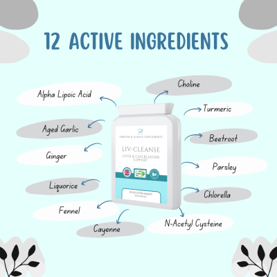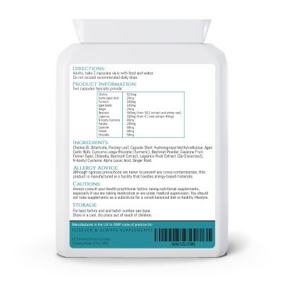 This food supplement is a healthy liver support formula, with a combination of herbal extracts and powders, plus vitamins – choline, Alpha Lipoic Acid (ALA), turmeric, ginger root, aged garlic, beetroot, liquorice root, N-Acetyl L- Cysteine, parsley leaf, fennel seed, cayenne and Chlorella.