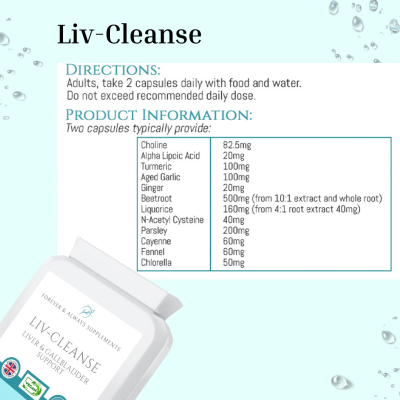 Detox, Cleanse & Repair -Liv-cleanse is specifically formulated to support liver detox and repair. It is a powerful, yet gentle natural supplement to help reduce liver toxins and support the body’s natural detoxification process. Supports the repair of liver & gallbladder cells to maintain a normal liver function.