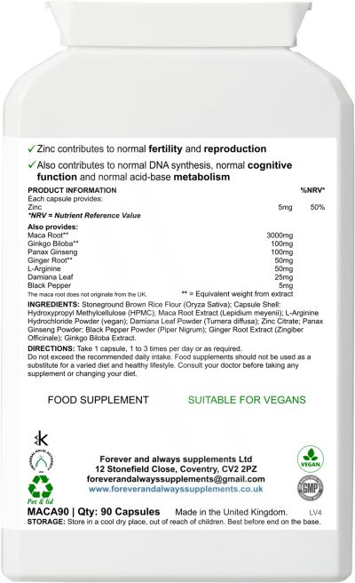 INGREDIENTS: Stoneground Brown Rice Flour (Oryza Sativa); Capsule Shell: Hydroxypropyl Methylcellulose (HPMC); Maca Root Extract (Lepidium meyenii); L-Arginine Hydrochloride Powder (vegan); Damiana Leaf Powder (Turnera diffusa); Zinc Citrate; Panax Ginseng Powder; Black Pepper Powder (Piper Nigrum) (ORG); Ginger Root Extract (Zingiber Officinale); Ginkgo Biloba Extract.