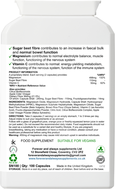 INGREDIENTS: Magnesium Oxide, Magnesium Hydroxide, Capsule Shell: Hydroxypropyl Methylcellulose (HPMC), Magnesium Sulphate Heptahydrate, Magnesium Citrate, Sugar Beet Fibre Powder (Beta Vulgaris), Vitamin C (as Ascorbic Acid), Fructo-oligosaccharides Powder, Brown Rice Flour (Oryza Sativa), Citric Acid, Citrus Bioflavonoids Complex, Apple Cider Vinegar Powder (Malus Sylvestris).