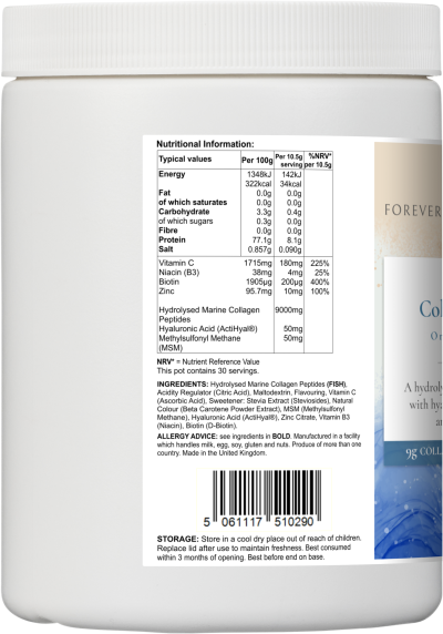 - Hydrolysed marine collagen / collagen peptides (9g / serving)