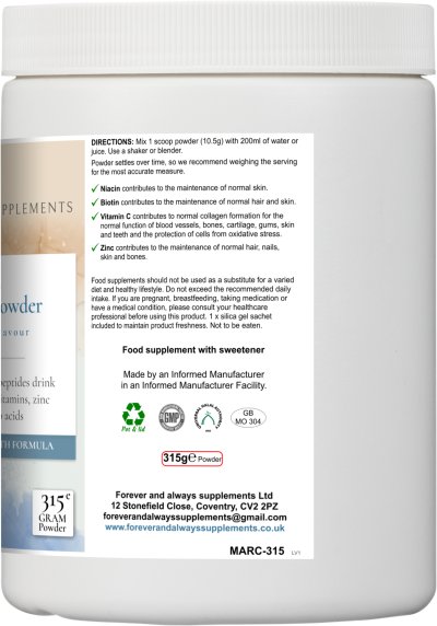 Ingredients: Hydrolysed Marine Collagen Peptides (FISH), Acidity Regulator (Citric Acid), Maltodextrin, Flavouring, Vitamin C (Ascorbic Acid), Sweetener: Stevia Extract (Steviosides), Natural Colour (Beta Carotene Powder Extract), MSM (Methylsulfonyl Methane), Hyaluronic Acid (ActiHyal®), Zinc Citrate, Vitamin B3 (Niacin), Biotin (D-Biotin).
