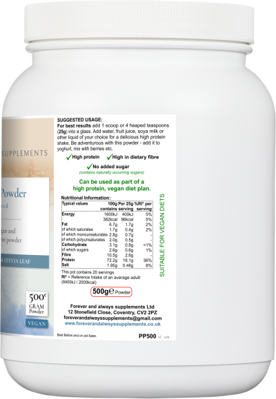 This unique formula contains a concentrated level of pea protein – from the 6% found in fresh peas up to around 80%, providing 72.2g of protein per 100g. It is high in complete protein (with an excellent amino acid profile), naturally low in carbohydrates and calories and contains no added sugar, salt or other ‘nasties’.