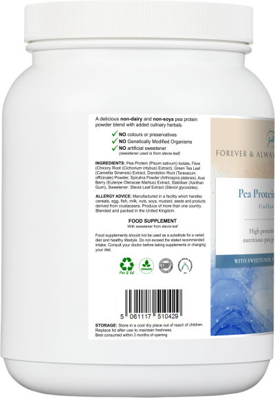 High-fibre pea protein powder, with added foods and herbs.