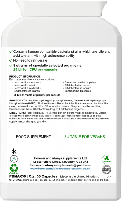 A multi-strain combination of 8 live biotic cultures, providing 20 billion viable organisms per capsule.