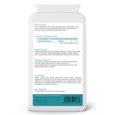 High Strength – 3000mg per serving – Pure Creatine Monohydrate (1000 mg per tablet), 3 Tablets per serving