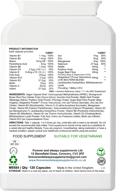 INGREDIENTS: Vegan Capsule Shell: Hydroxypropyl Methylcellulose (HPMC), Stoneground Brown Rice Flour (Gluten Free) (Oryza Sativa), Ascorbic Acid Powder, Alfalfa Herb Powder (Medicago Sativa), Psyllium Husk Powder (Plantago Ovata), Sugar Beet Fibre Powder (Beta Vulgaris), Seagreens Powder (Fucus Vesiculosus), Iron (as Ferrous Glycinate), Zinc (as Zinc Citrate), Vitamin B3 (Nicotinamide), Vitamin E (D-alpha-tocopheryl Succinate), Manganese Citrate, Vitamin B5 (Calcium Pantothenate), Selenomethionine (Calcium Phosphate), Vitamin K2 (as Menaquinone-7), Lactobacillus Acidophillus Powder, Vitamin B6 (Pyridoxine Hydrochloride), Vitamin B2 (Riboflavin), Vitamin B1 (as Thiamin Hydrochloride), Vitamin D3 (Cholecalciferol), Bifidobacterium Lactis Powder, Folic Acid, Iodine (as Potassium Iodide), Biotin (as d-Biotin), Vitamin B12 (as Cyanocobalamin Pure).