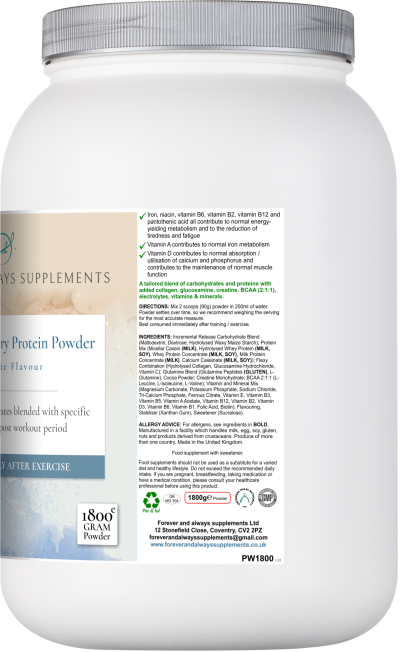 Ingredients: Incremental Release Carbohydrate Blend (Maltodextrin, Dextrose, Hydrolysed Waxy Maize Starch); Protein Mix (Micellar Casein (MILK), Hydrolysed Whey Protein (MILK, SOY), Whey Protein Concentrate (MILK, SOY), Milk Protein Concentrate (MILK), Calcium Caseinate (MILK, SOY)); Flexy Combination (Hydrolysed Collagen, Glucosamine Hydrochloride, Vitamin C); Glutamine Blend (Glutamine Peptides (GLUTEN), L-Glutamine); Cocoa Powder; Creatine Monohydrate; BCAA 2:1:1 (L-Leucine, L-Isoleucine, L-Valine); Vitamin and Mineral Mix (Magnesium Carbonate, Potassium Phosphate, Sodium Chloride, Tri-Calcium Phosphate, Ferrous Citrate, Vitamin E, Vitamin B3, Vitamin B5, Vitamin A Acetate, Vitamin B12, Vitamin B2, Vitamin D3, Vitamin B6, Vitamin B1, Folic Acid, Biotin); Flavouring, Stabiliser (Xanthan Gum), Sweetener (Sucralose).